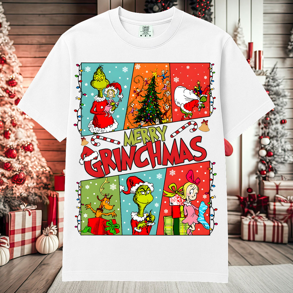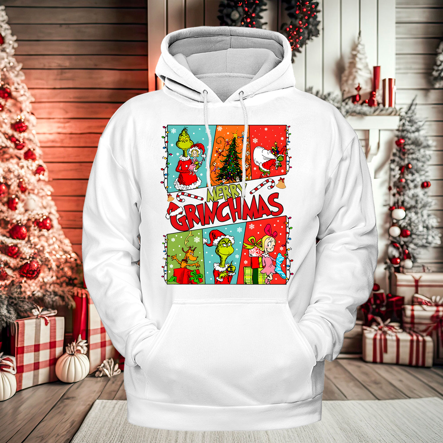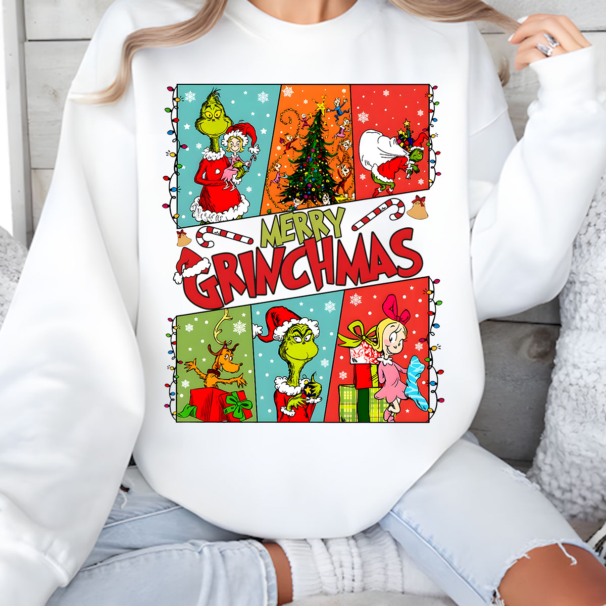 This “Merry Grinchmas” sweatshirt features everyone’s favorite Christmas troublemaker — The Grinch — in a bright, comic-style design that spreads festive mischief and laughter everywhere you go.