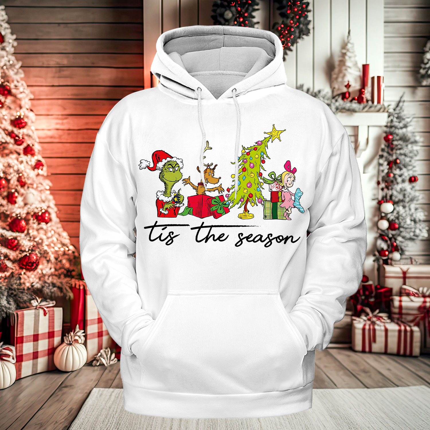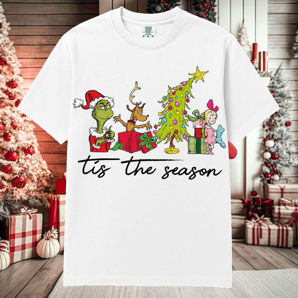 This “Tis The Season” sweatshirt captures the playful and heartwarming spirit of the holidays — featuring the Grinch, Max the dog, a sparkling Christmas tree, and Cindy Lou Who in one adorable festive scene.