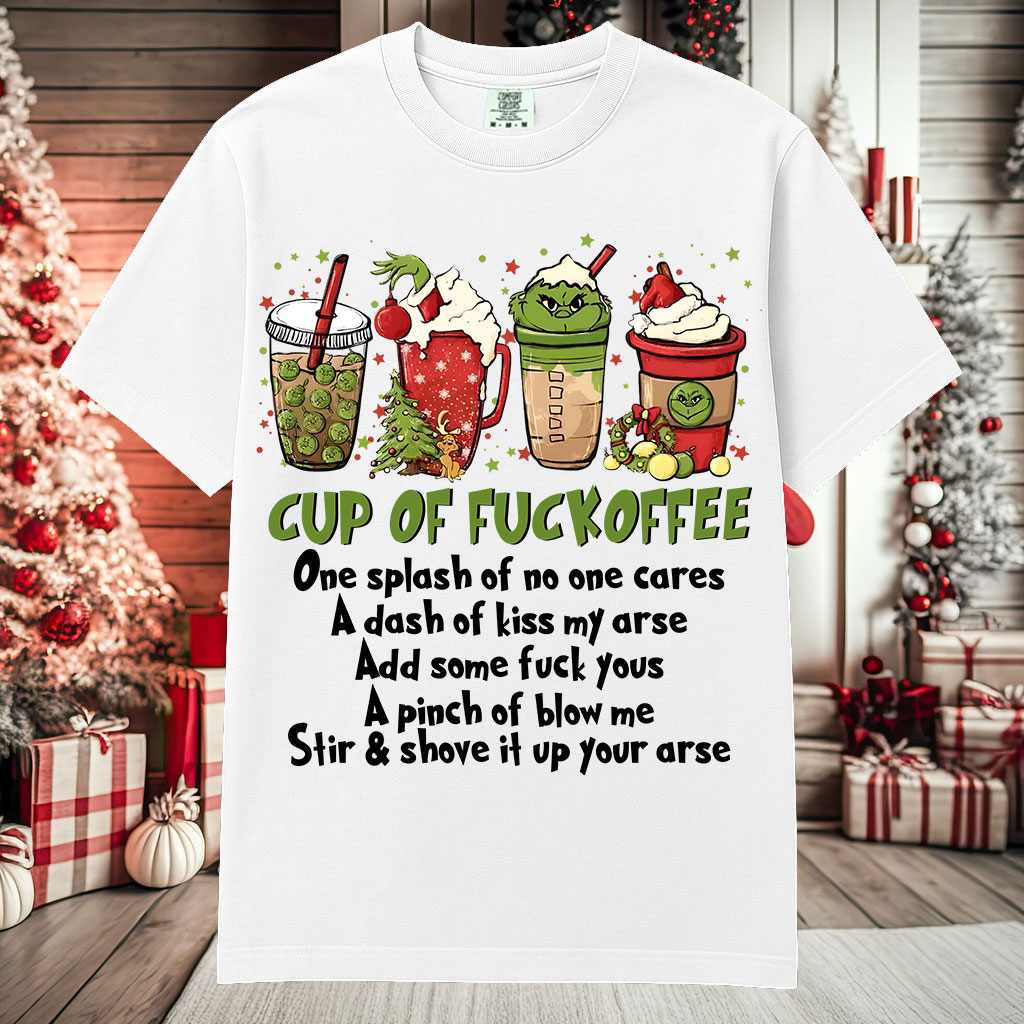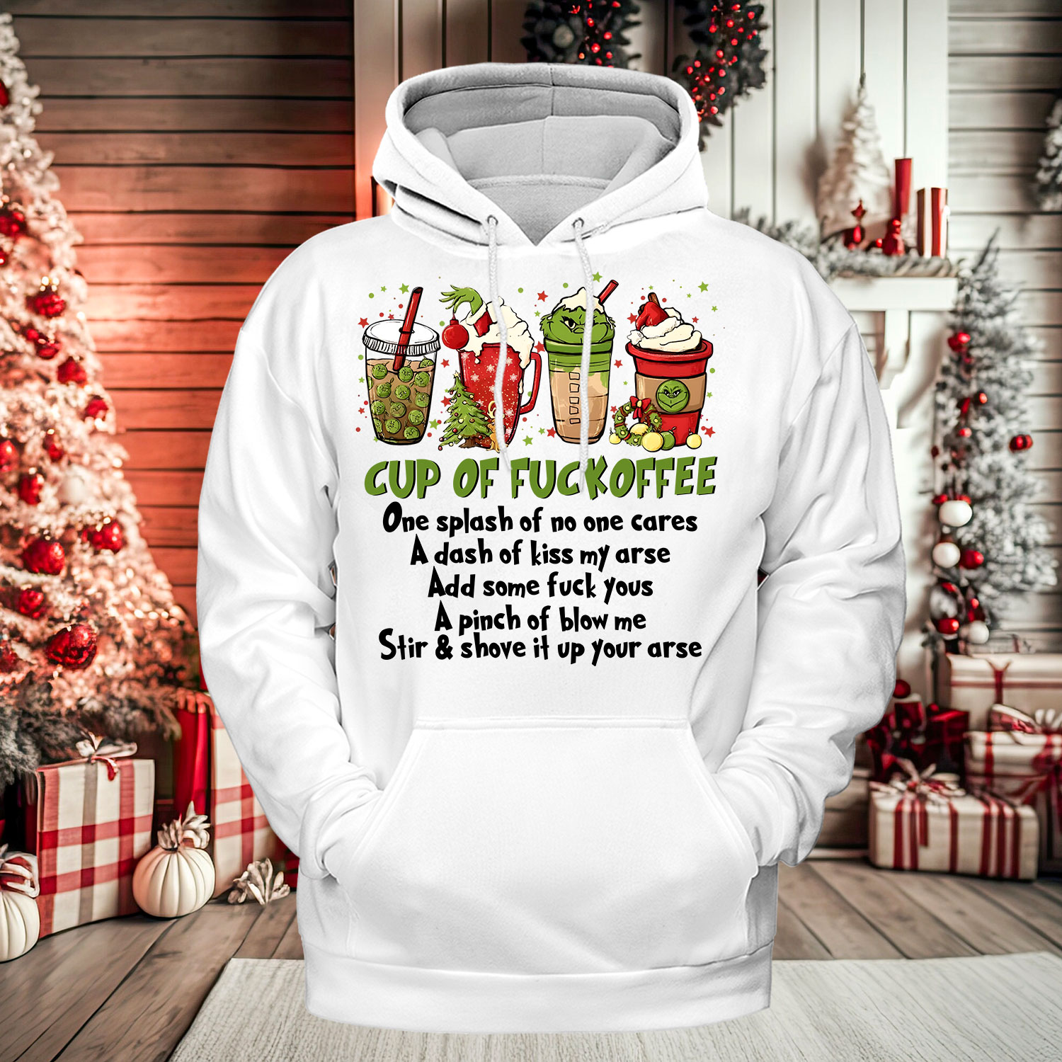 Add a splash of sarcasm to your holiday season with this hilarious “Cup of Fuckoffee” Grinch sweatshirt!