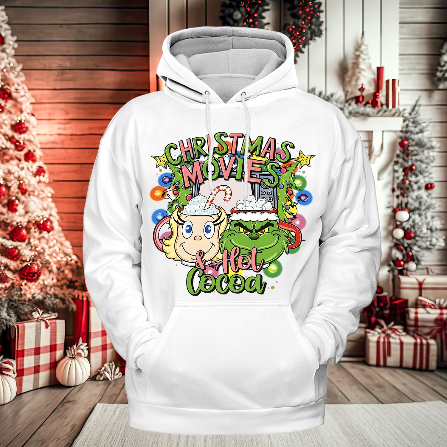 This sweatshirt wraps you in holiday warmth and nostalgic joy, reminding everyone that the best part of Christmas is a cozy night, your favorite movies, and a warm cup of cocoa.