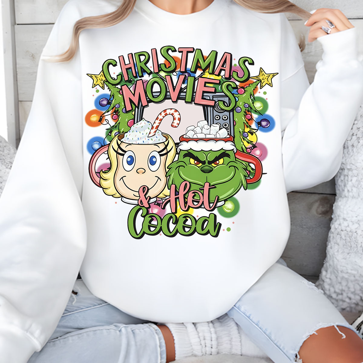 Get cozy this holiday season with our adorable “Christmas Movies & Hot Cocoa” sweatshirt featuring the mischievous Grinch and the sweet Cindy Lou Who! Perfect for snuggling up on the couch, sipping hot cocoa, and watching your favorite Christmas classics.