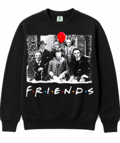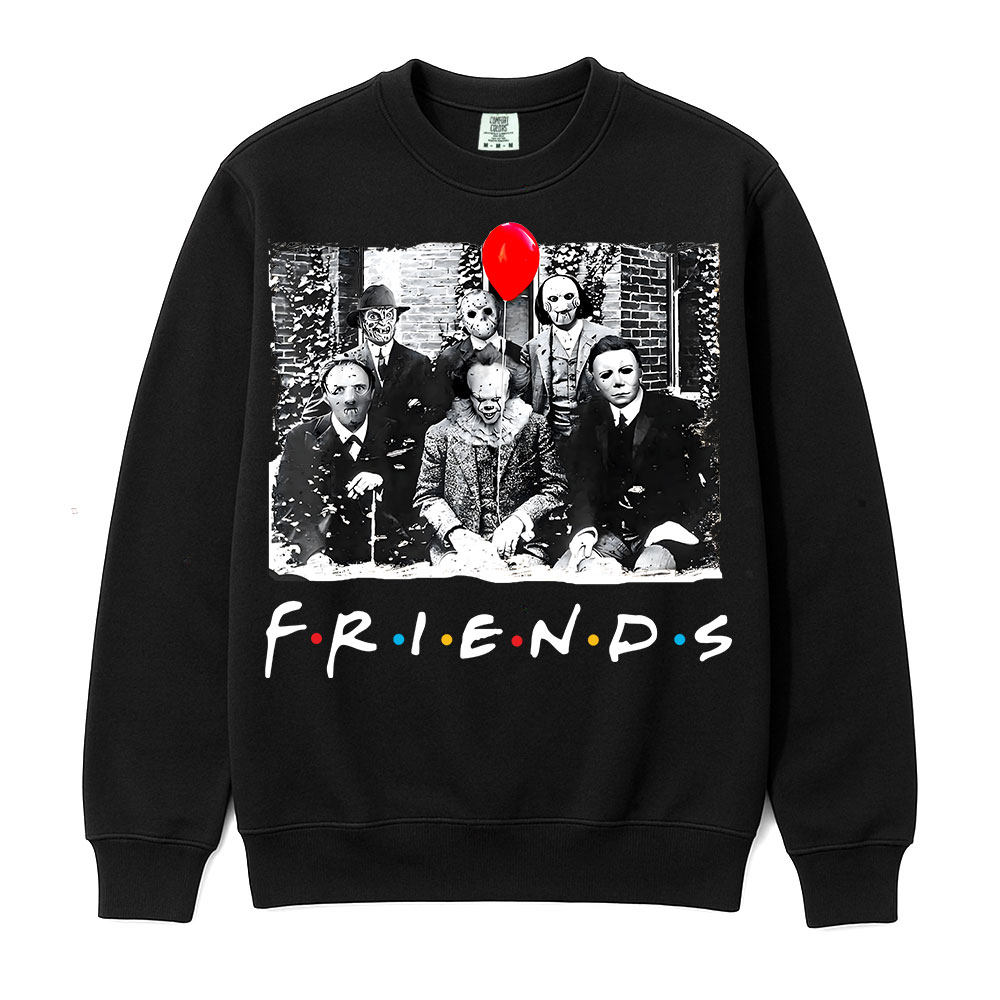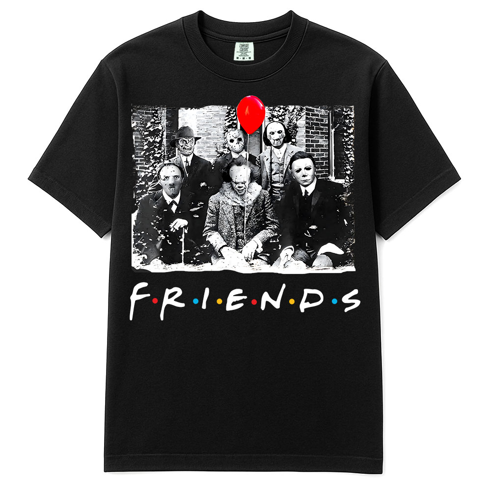 This bold black T-shirt comfort blends horror with humor, featuring iconic movie villains—Chucky, Jason Voorhees, Michael Myers, Pennywise, and Freddy Krueger—lined up in a vibrant, stylized design. Each character’s face is placed inside vertical panels, forming a colorful and striking visual. Beneath them, the word “FRIENDS” is displayed in the style of the famous TV show logo, creating a playful contrast between terrifying figures and the idea of friendship. Perfect for horror fans with a sense of humor.