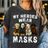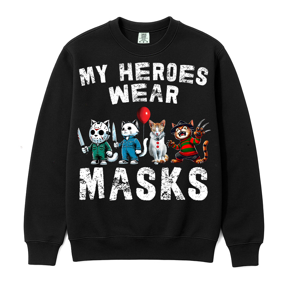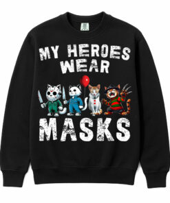 This fun black T-shirt Comfort reimagines classic horror villains as adorable cats. Jason Voorhees, Michael Myers, Pennywise, and Freddy Krueger are transformed into feline characters, each dressed in their iconic costumes—complete with mask, balloon, and claws. Below them, the bold text reads: “MY HEROES WEAR MASKS”, creating a clever play on words that blends spooky and cute. A perfect Halloween shirt for cat lovers and horror fans alike.