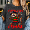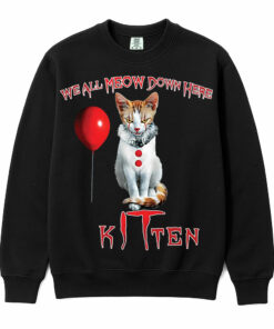 This spooky and humorous T-shirt Comfort features a menacing cat dressed as Pennywise the Dancing Clown from Stephen King’s IT. The cat wears the signature white clown costume with red buttons and ruffled collar, paired with an intense, sinister expression. Next to it floats the iconic red balloon, a symbol of the horror classic. The eerie text “WE ALL MEOW DOWN HERE” arcs above the design, while the word “KITTEN” appears below in a creepy red font, adding a clever feline twist to the chilling quote. Printed on a black background, this shirt is perfect for horror fans and cat lovers with a dark sense of humor.