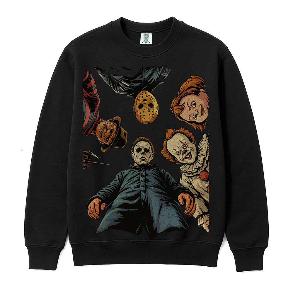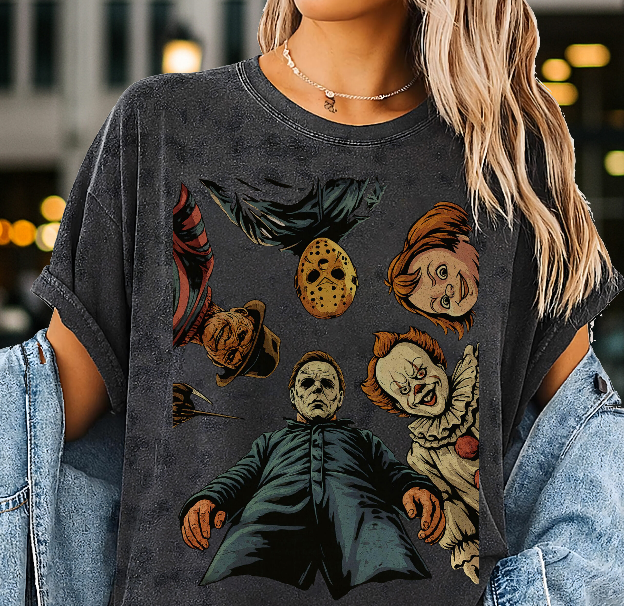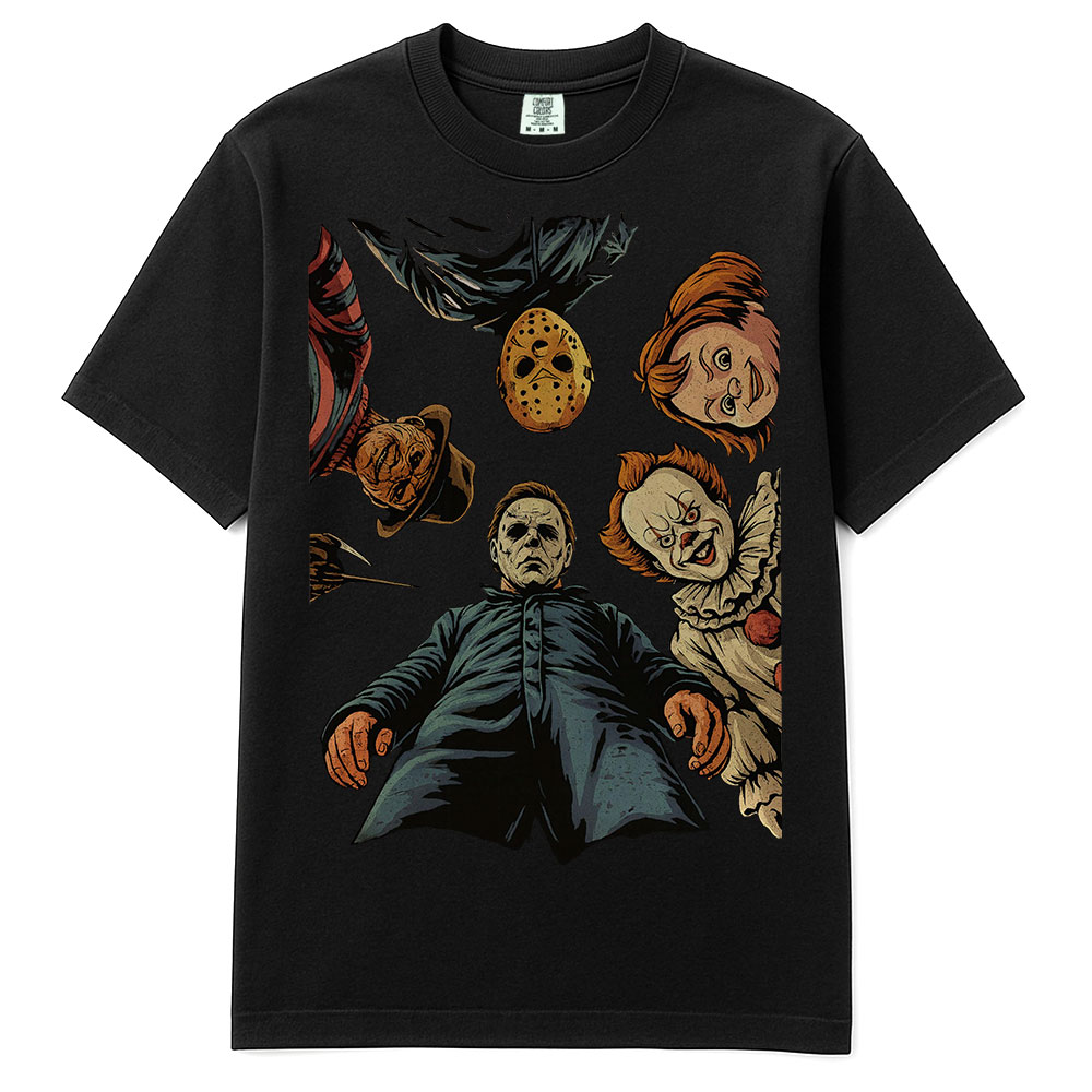 This bold, edgy t-shirt Comfort is a must-have for true horror lovers. With vibrant illustrations of some of cinema’s most terrifying villains – Freddy Krueger, Jason Voorhees, Michael Myers, Pennywise, and Chucky – this shirt combines nostalgic fear with modern streetwear vibes.