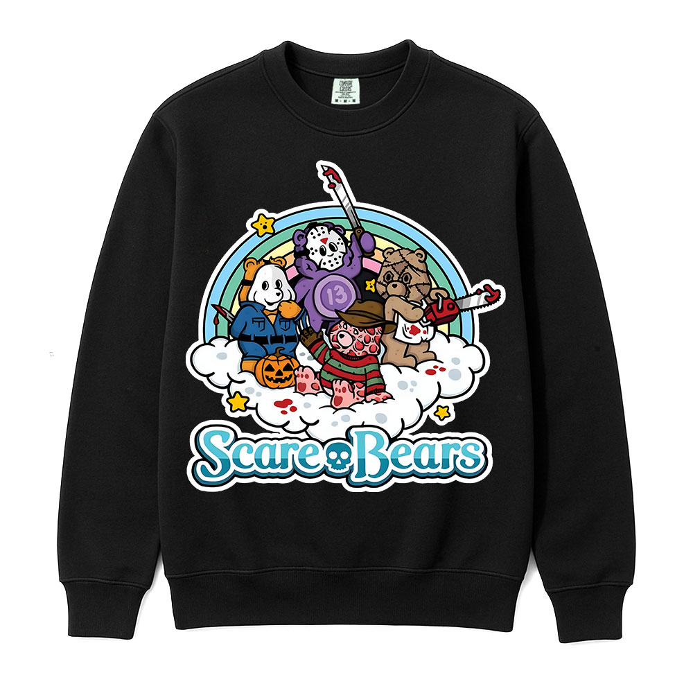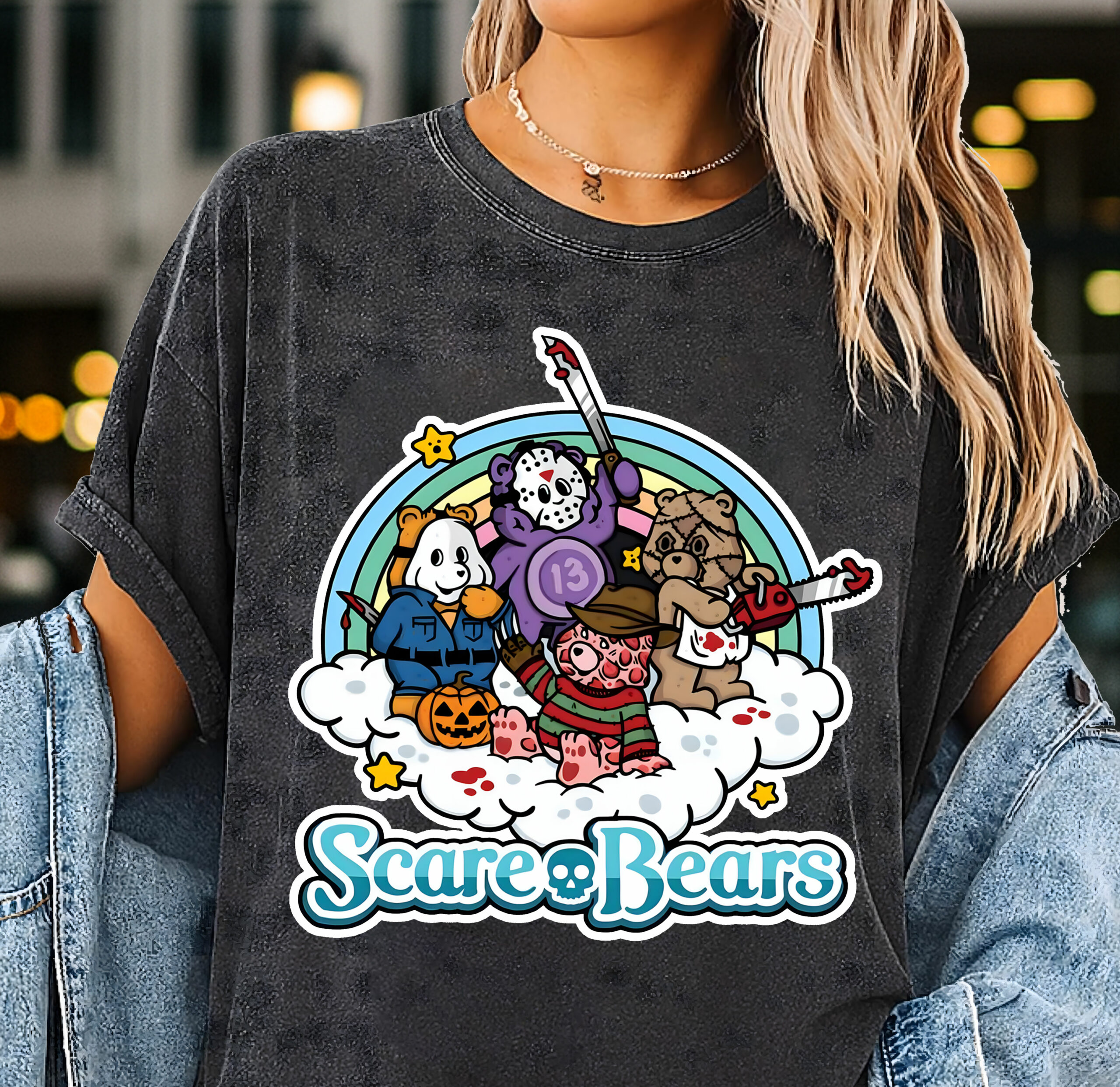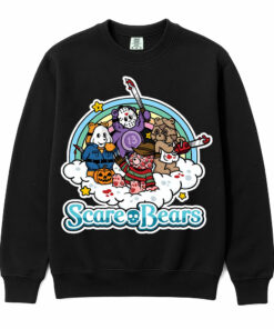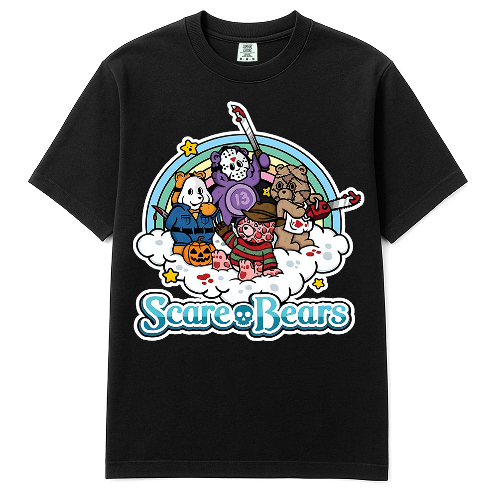 Cute meets creepy in the best way possible with our Scare Bears Halloween tee! This fun twist on the classic Care Bears features adorable teddy bear versions of your favorite horror movie villains – Freddy Krueger, Jason Voorhees, Michael Myers, Leatherface, and more – all gathered under a rainbow on a cloud of blood-splattered fluff.